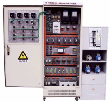該裝置按標(biāo)準(zhǔn)電氣控制柜設(shè)計(jì)制造規(guī)格,充分利用雙面位置,柜內(nèi)裝有完成各種照明電路所需的單相電度表、日光燈、單聯(lián)開關(guān)、插座、感應(yīng)開關(guān)、漏電開關(guān)等,以及電氣控制所需要的多種低壓電器,如漏電斷路器、熔斷器、電流互感器、交流接觸器、時(shí)間繼電器、熱繼電器、中間繼電器、行程開關(guān)、按鈕、信號燈、轉(zhuǎn)換開關(guān)、電壓表、電流表、功率表及電度表等,為了延長電器使用壽命,各電器的接點(diǎn)都與接線端子相連,再由接線端子與被控制電氣連接。